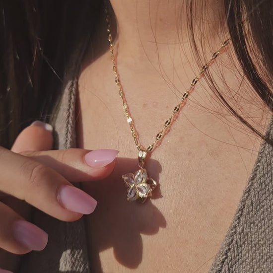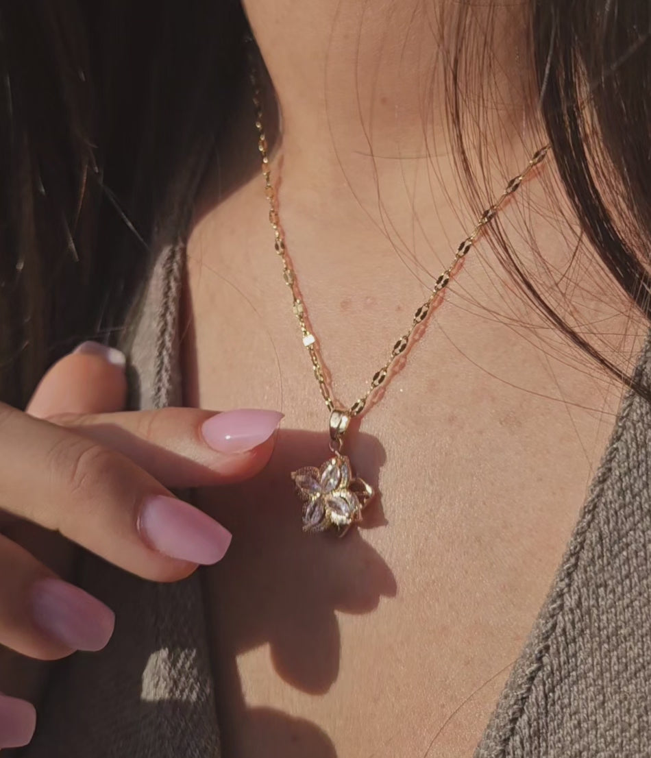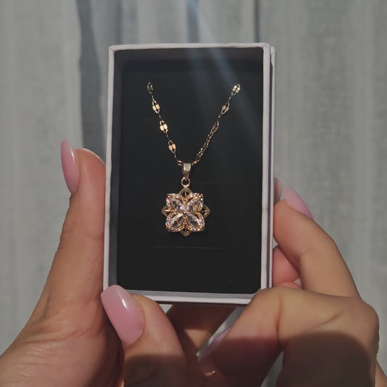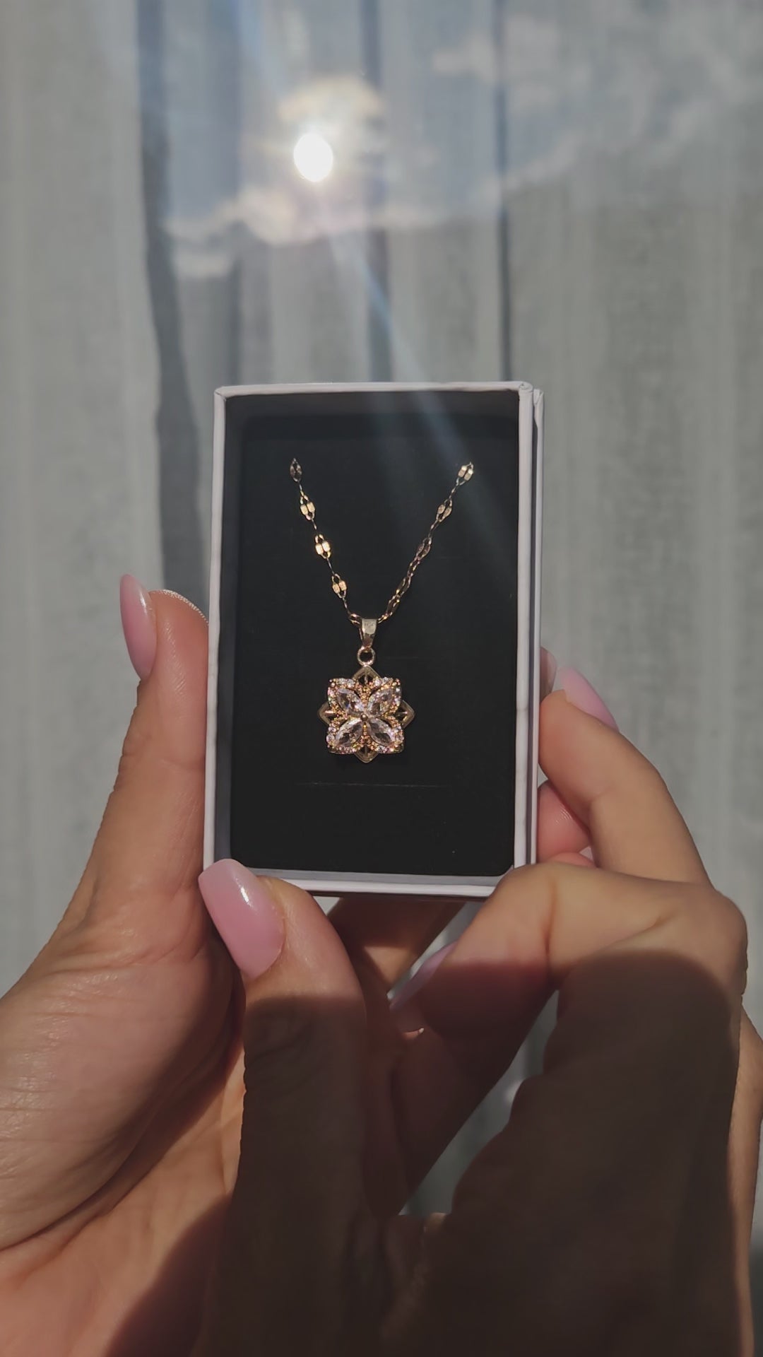 Diese elegante Halskette vereint stilvolles Design mit praktischer Funktion. Der wunderschöne Blütenanhänger aus hochwertigem Metall mit funkelnden Zirkonia-Steinen lässt sich sanft drehen – perfekt, um innere Ruhe zu finden und Stress im Alltag zu reduzieren.