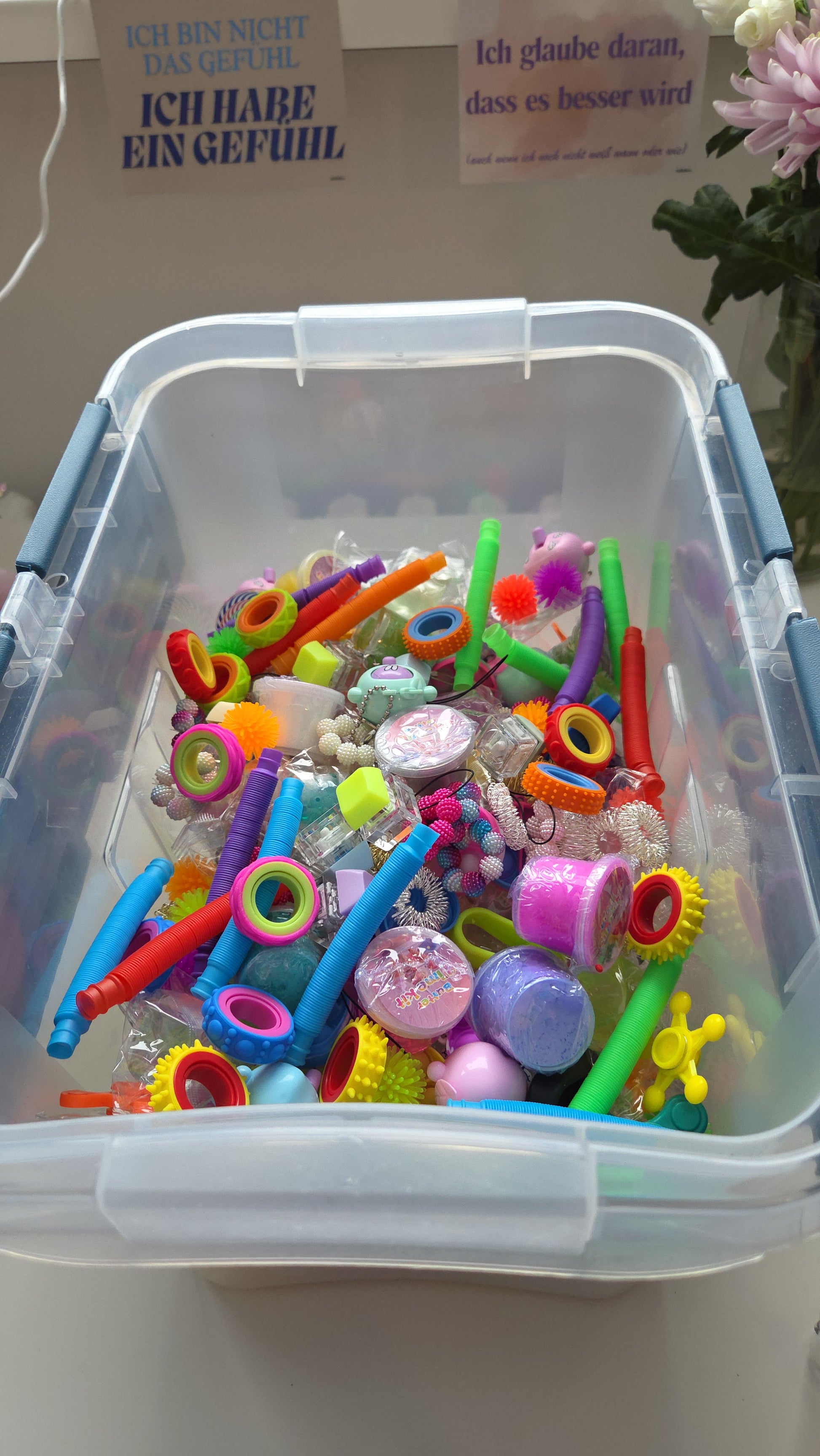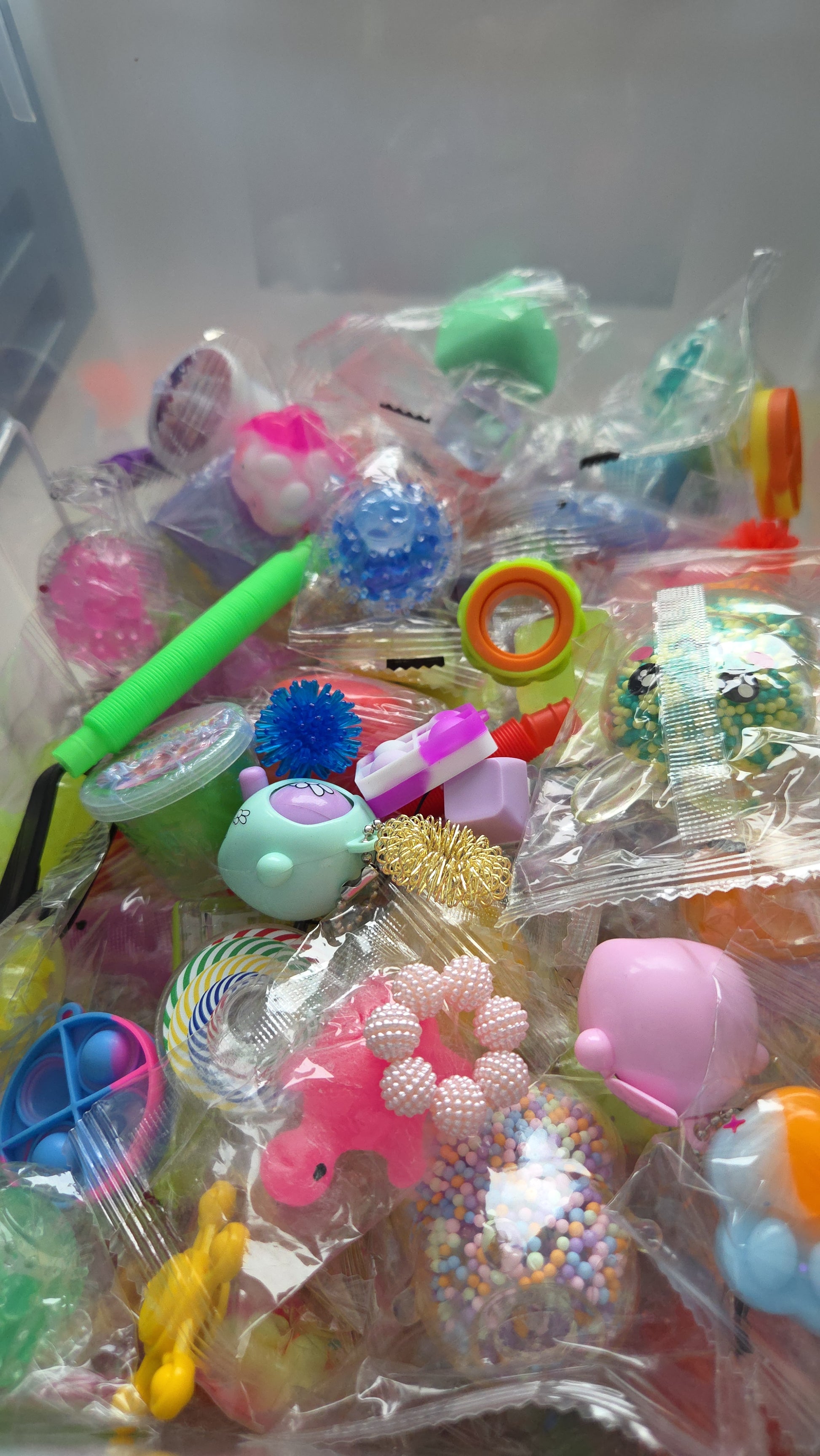 Diese bunte Mischung aus verschiedenen Anti-Stress- und Fidget-Artikeln sorgt für Abwechslung, Entspannung und spielerische Beschäftigung. Jede Schaufel enthält eine zufällige Auswahl aus Mini-Stressbällen, Akupressur-Ringen, Fidget-Spinnern, Mini-Slimes, Tastaturen und weiteren kleinen Fidget-Elementen.