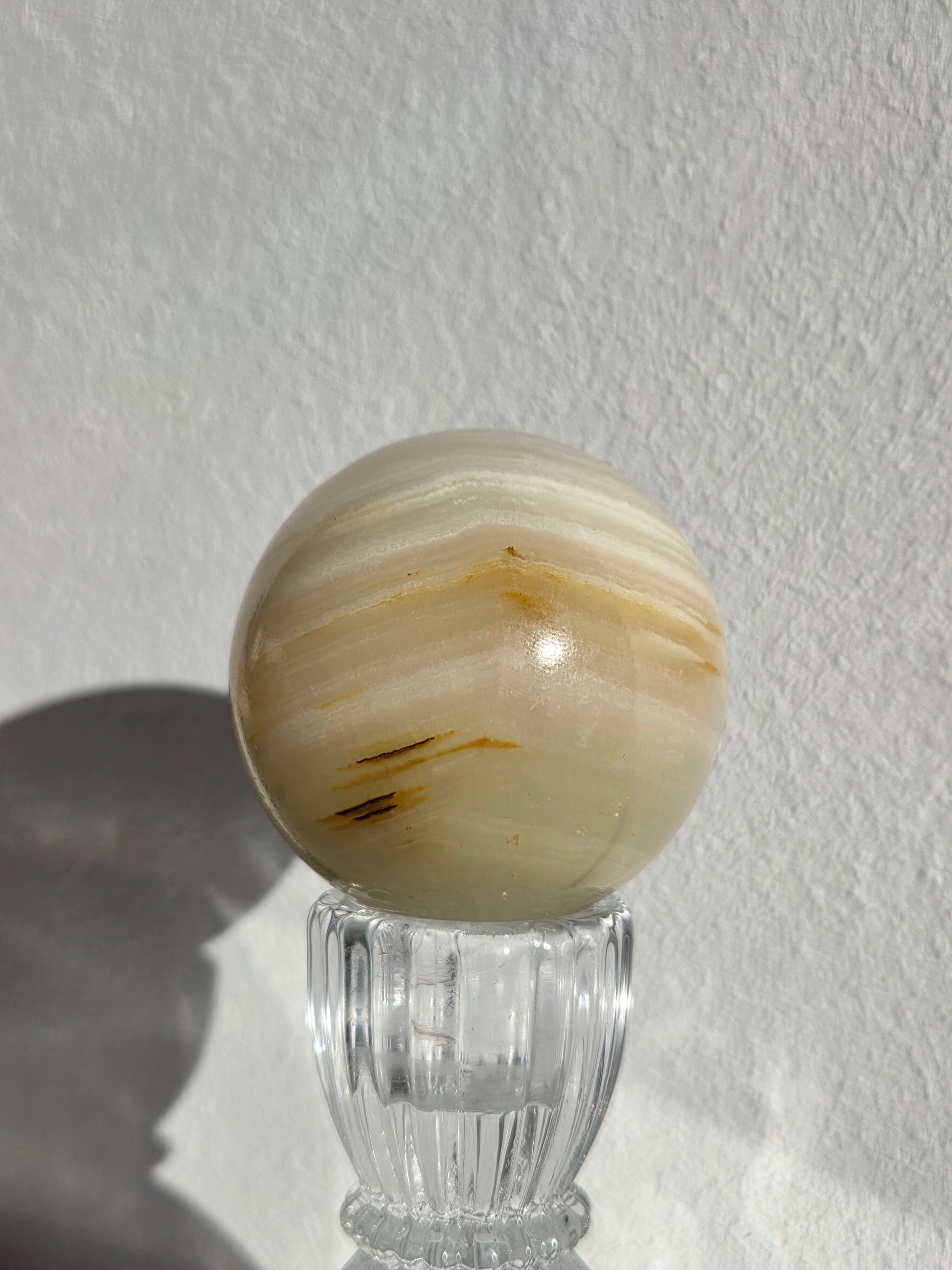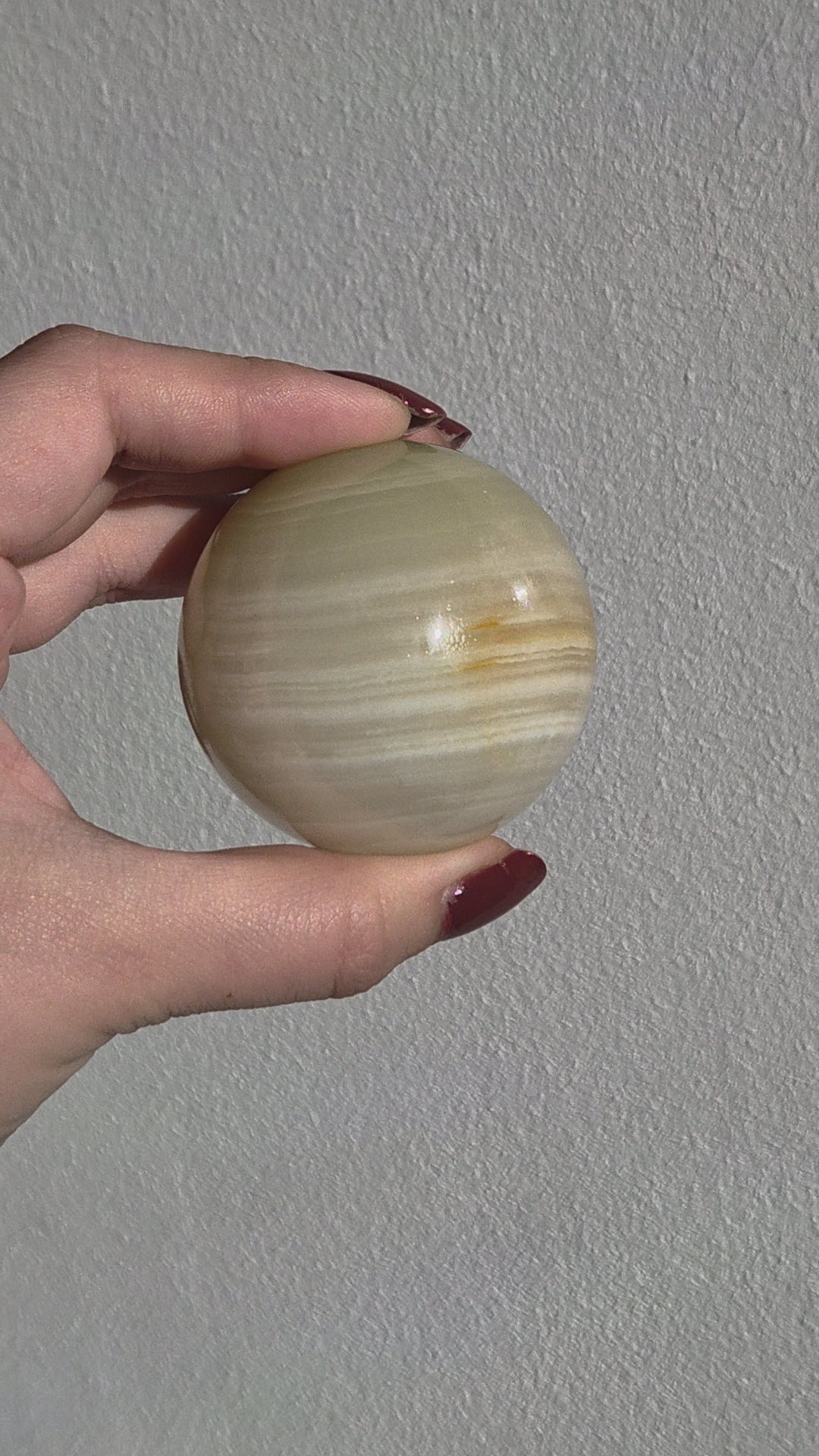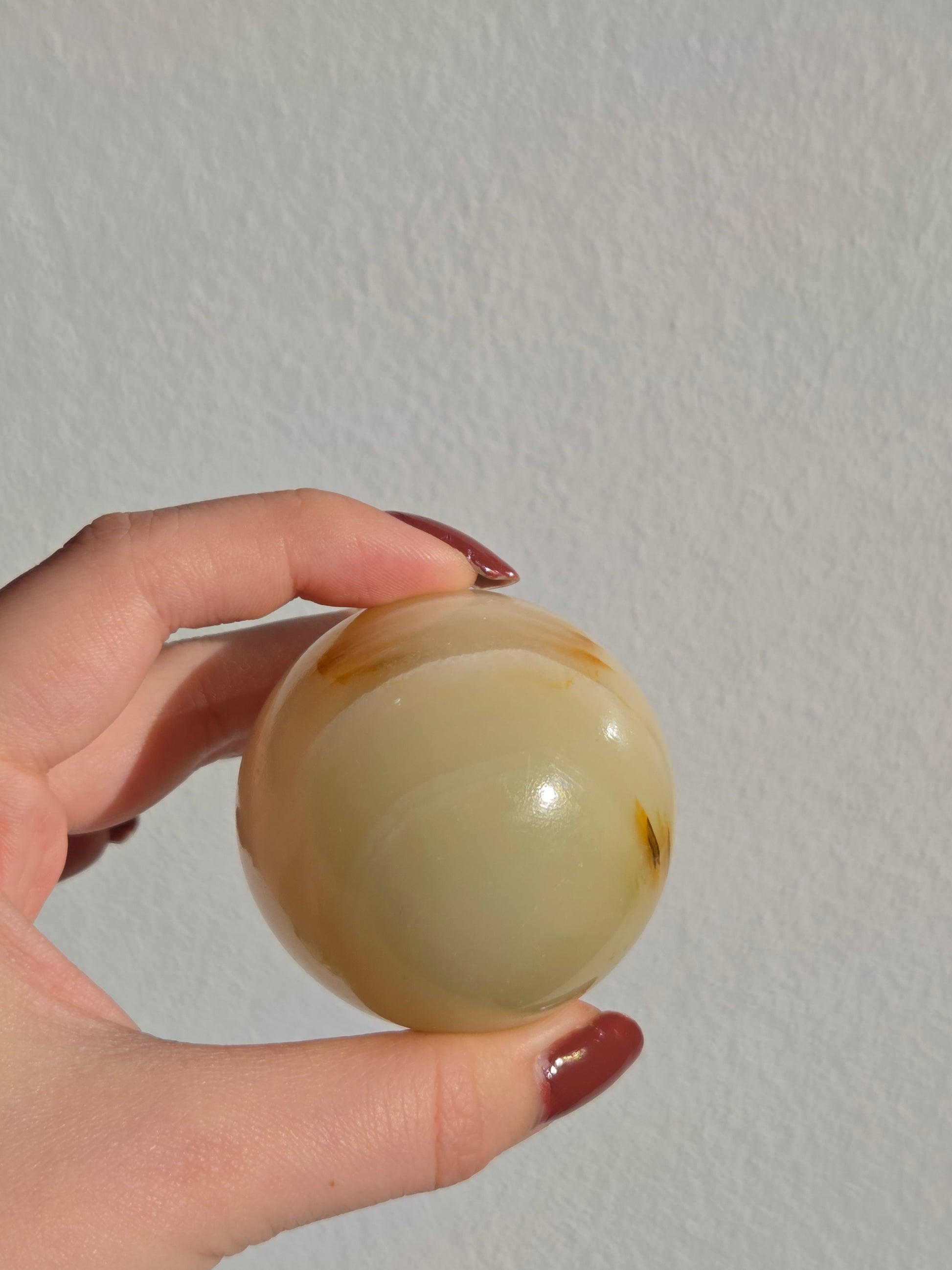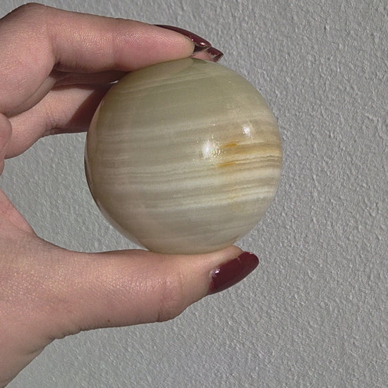 Onyx (Calcit) ist ein lichtdurchlässiger Naturstein, dessen zarte Farbverläufe durch die Politur besonders schön zur Geltung kommen. Die Kugelform sorgt für eine ausgewogene, gleichmäßige Wirkung und eignet sich ideal für Wohnraumdekoration, Meditation oder als besonderes Geschenk.