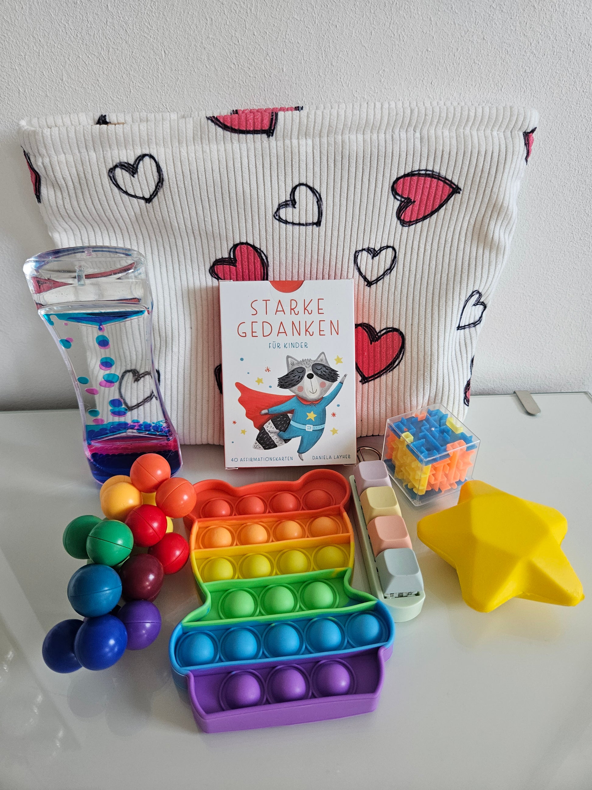 Dieses Set enthält zum einen Affirmationskarten für Kinder, als auch verschiedene Skills/Fidgets die Ihnen dabei helfen sollen, Emotionen besser zu regulieren.