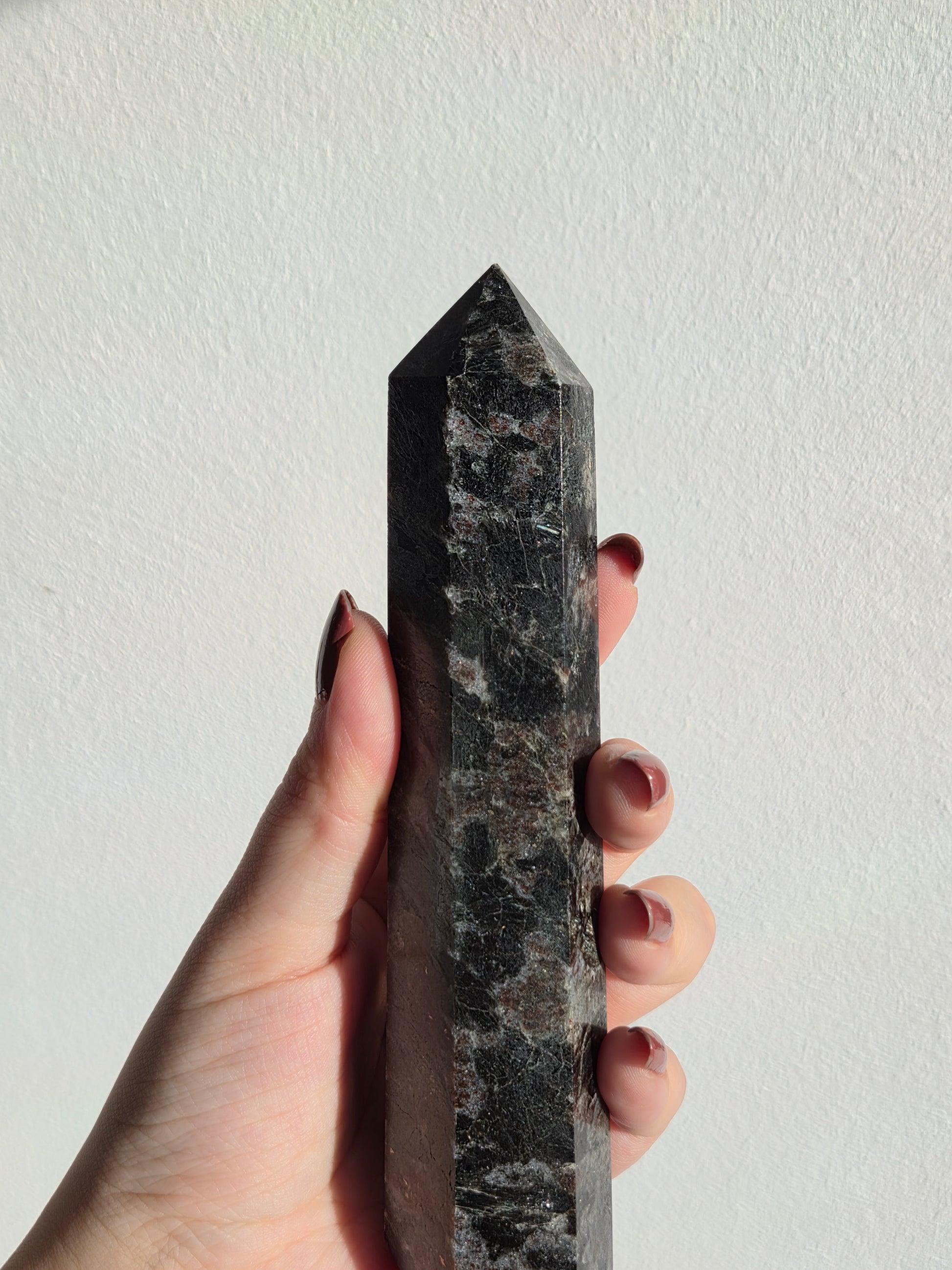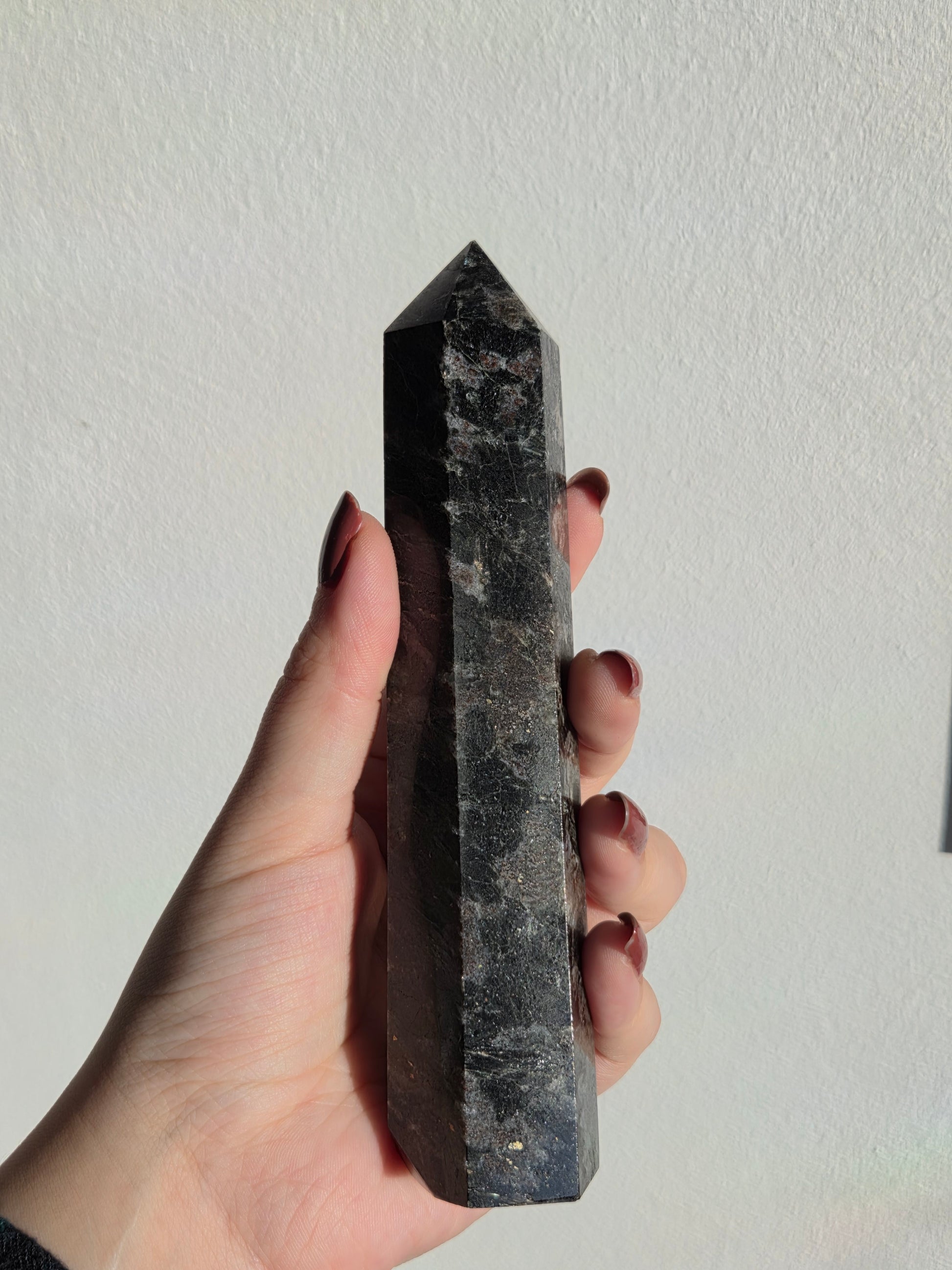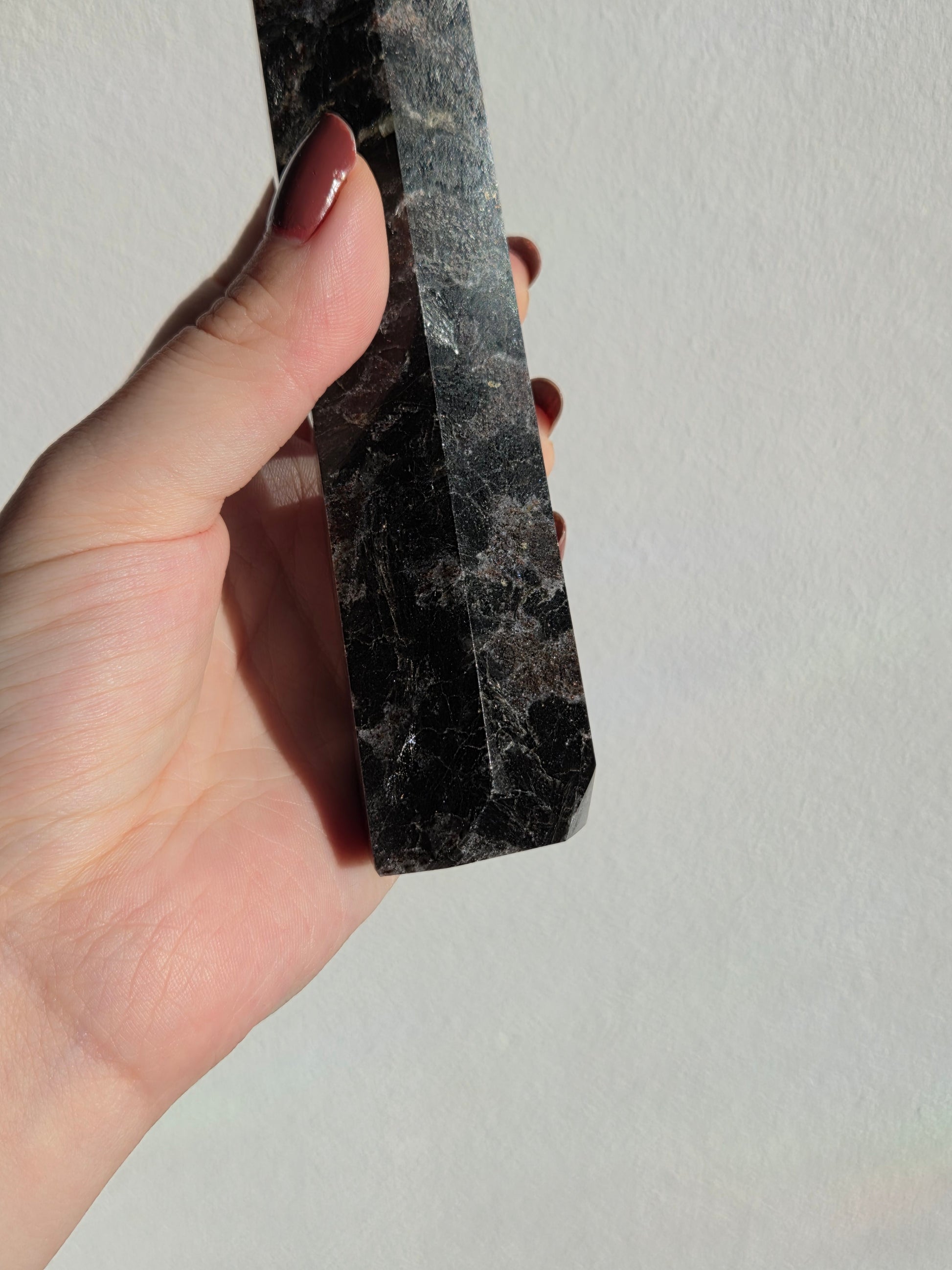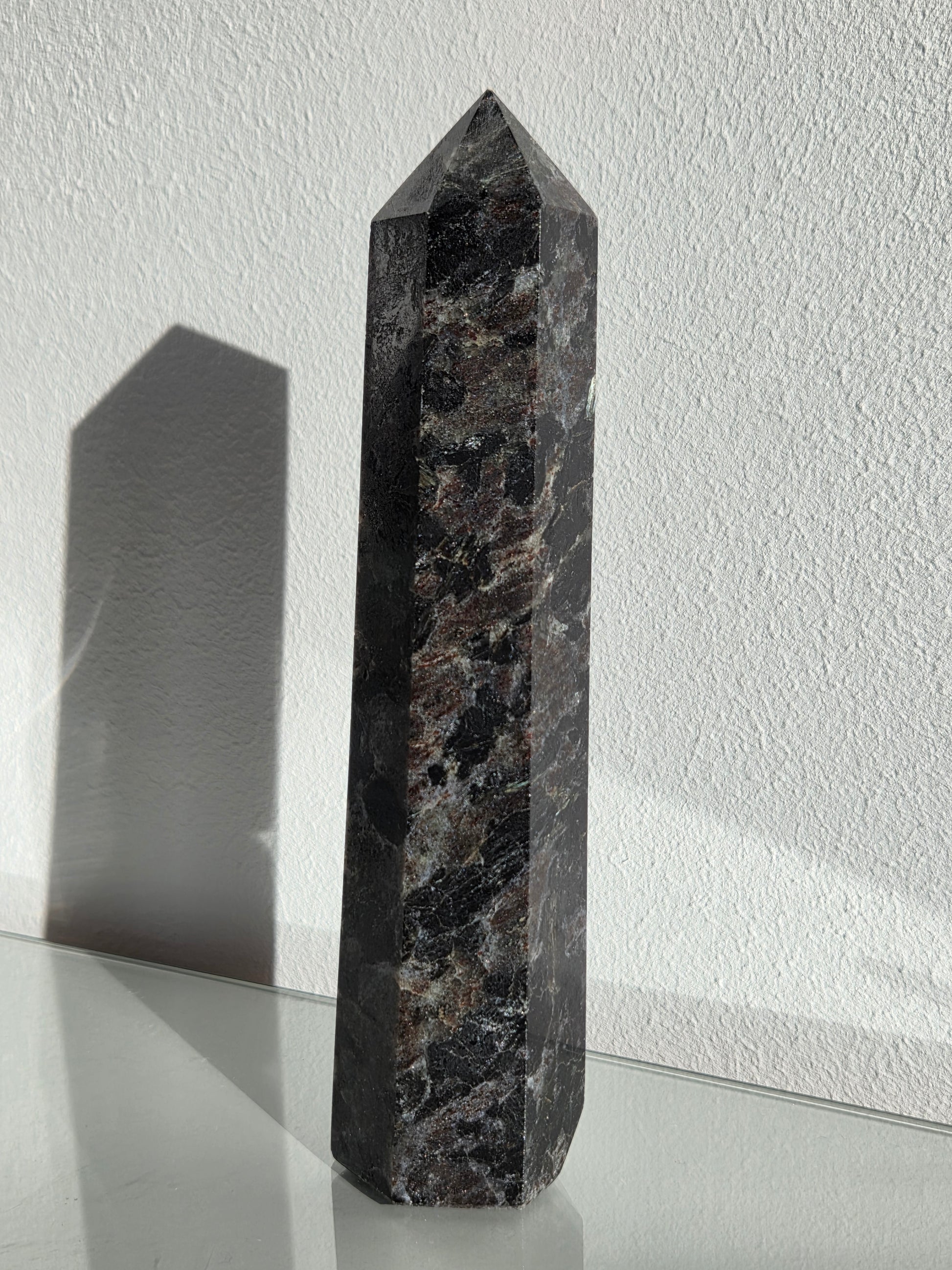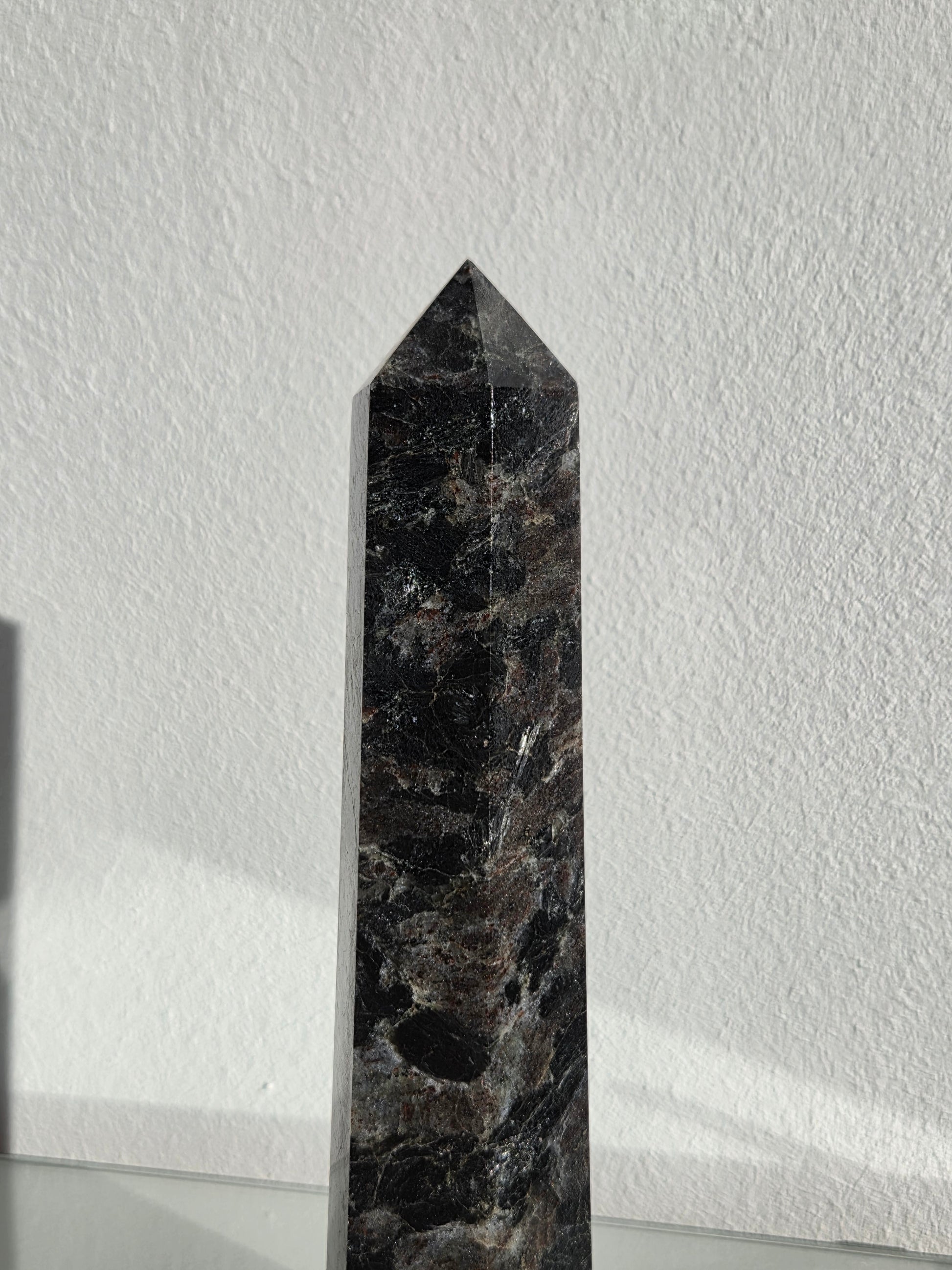 Larvikit ist ein aus Norwegen stammendes Tiefengestein und wird im Handel häufig als schwarzer Labradorit bezeichnet. In Spitzenform wirkt der Stein besonders kraftvoll und zugleich ruhig – ideal als dekoratives Einzelstück, für Meditation oder als Blickfang im Wohnraum.
