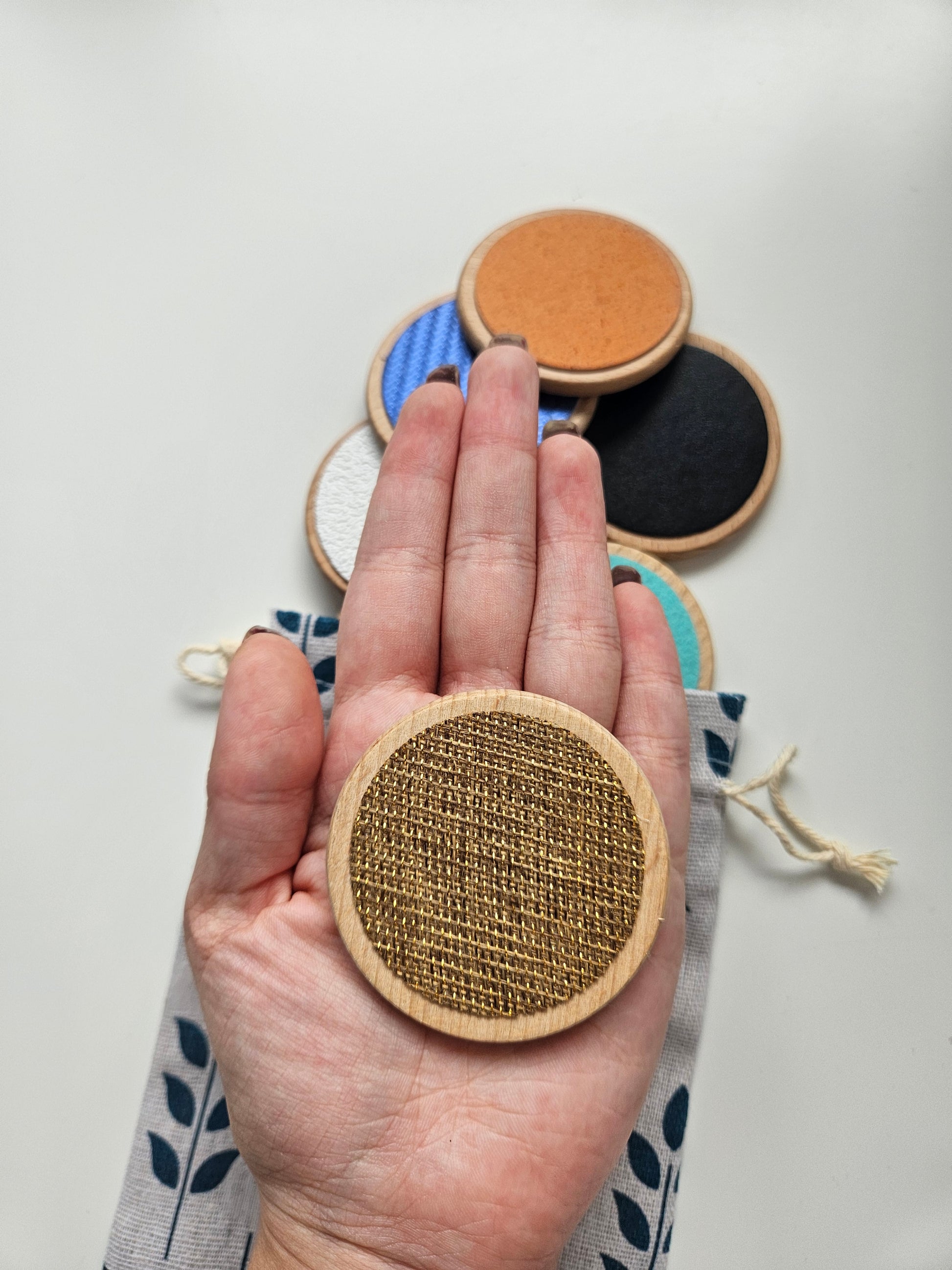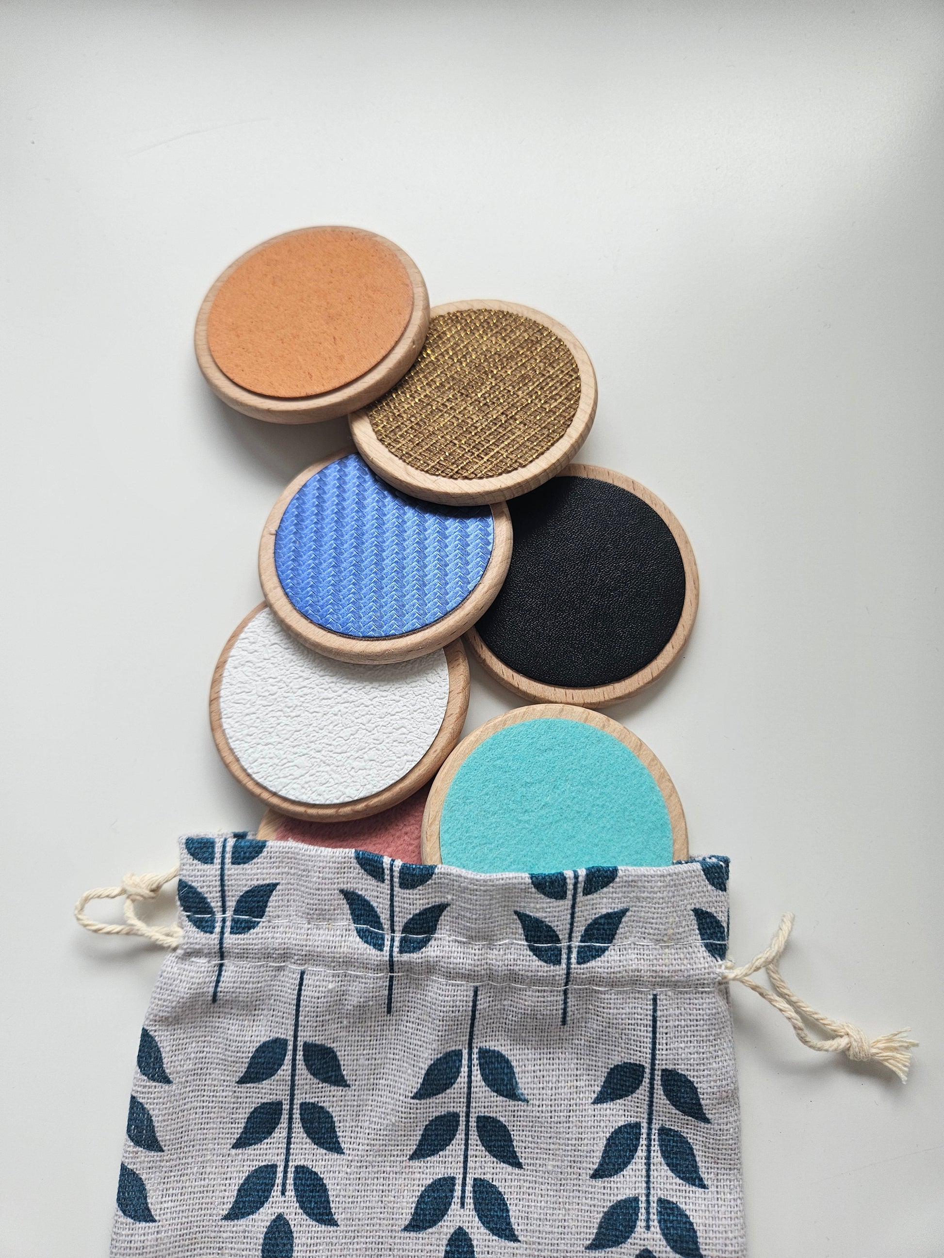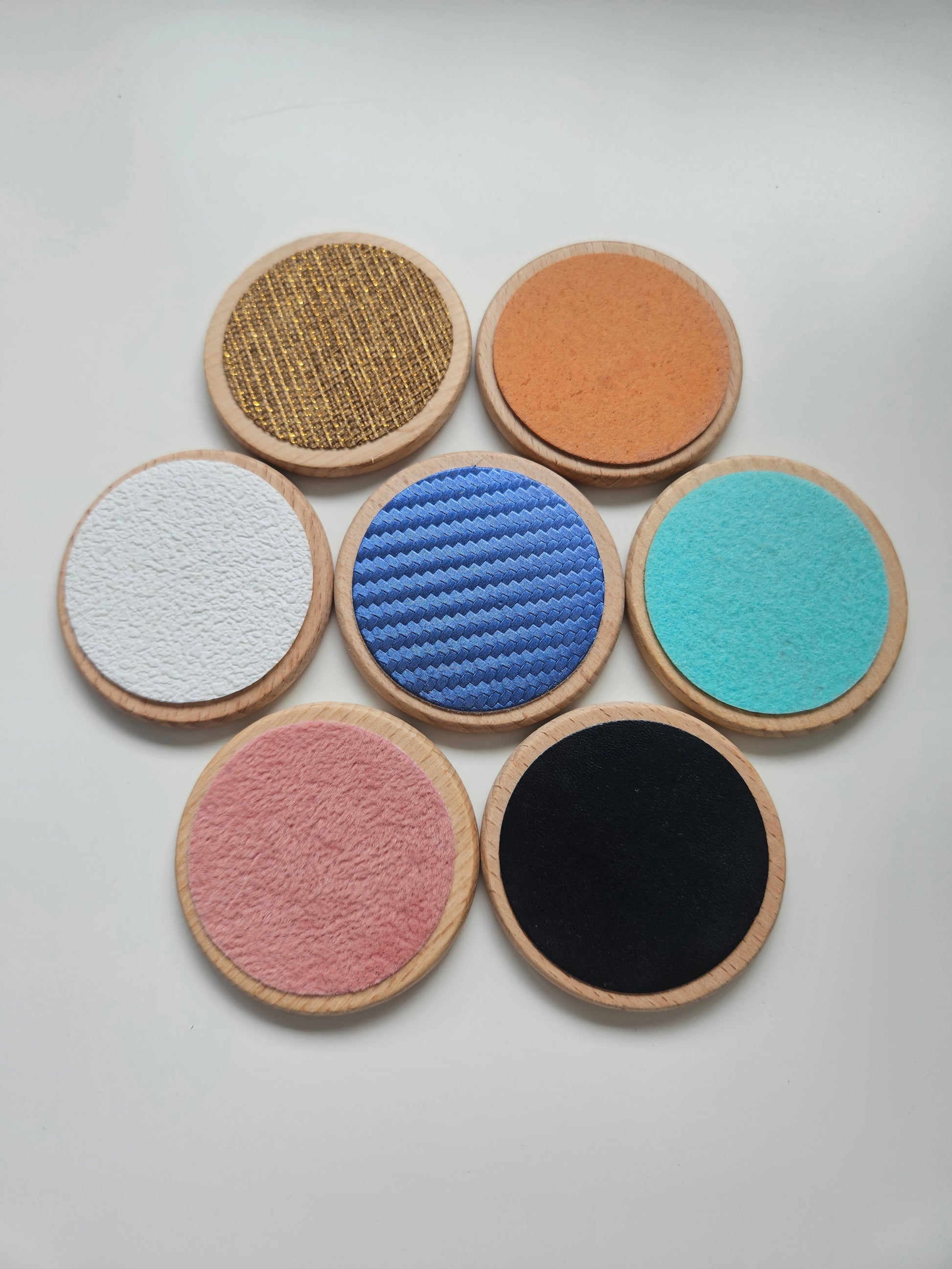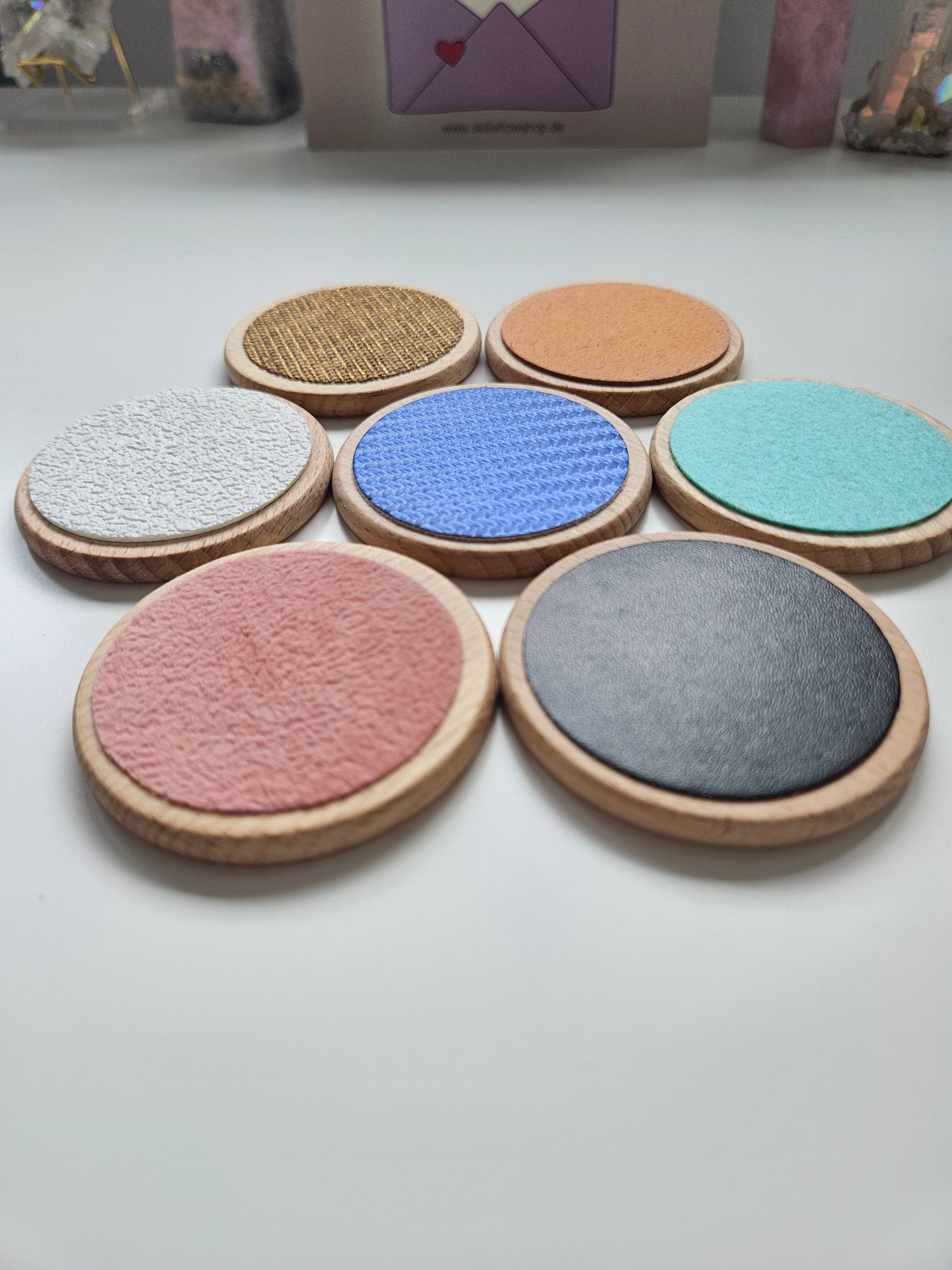 • Set aus 7 runden Holzkarten mit vielfältigen Oberflächenstrukturen