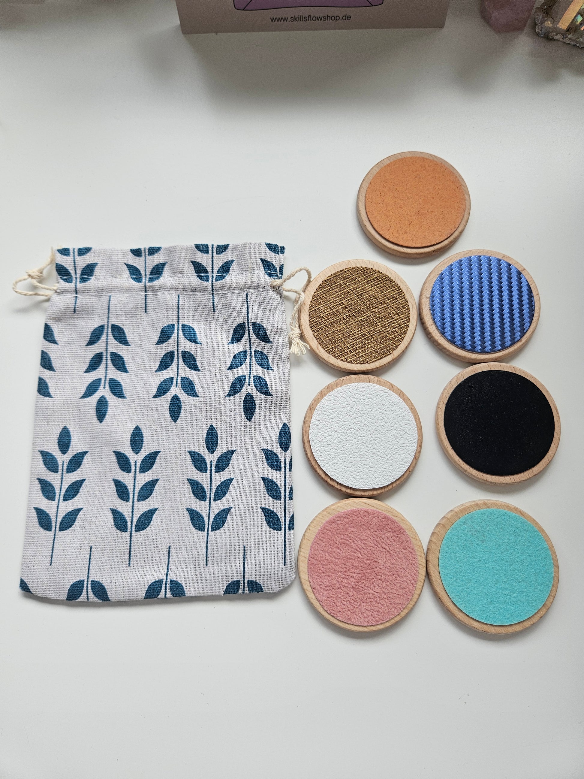 Dieses Set aus Fühl-Holz-Karten lädt Kinder ein, Materialien bewusst und mit allen Sinnen zu entdecken. Jede Karte besteht aus stabilem Holz und ist mit einer unterschiedlichen weichen Oberfläche versehen. Durch langsames Ertasten, Vergleichen und Benennen lernen Kinder, sich zu konzentrieren, ihre Wahrnehmung zu verfeinern und achtsam mit ihrer Umwelt umzugehen.
