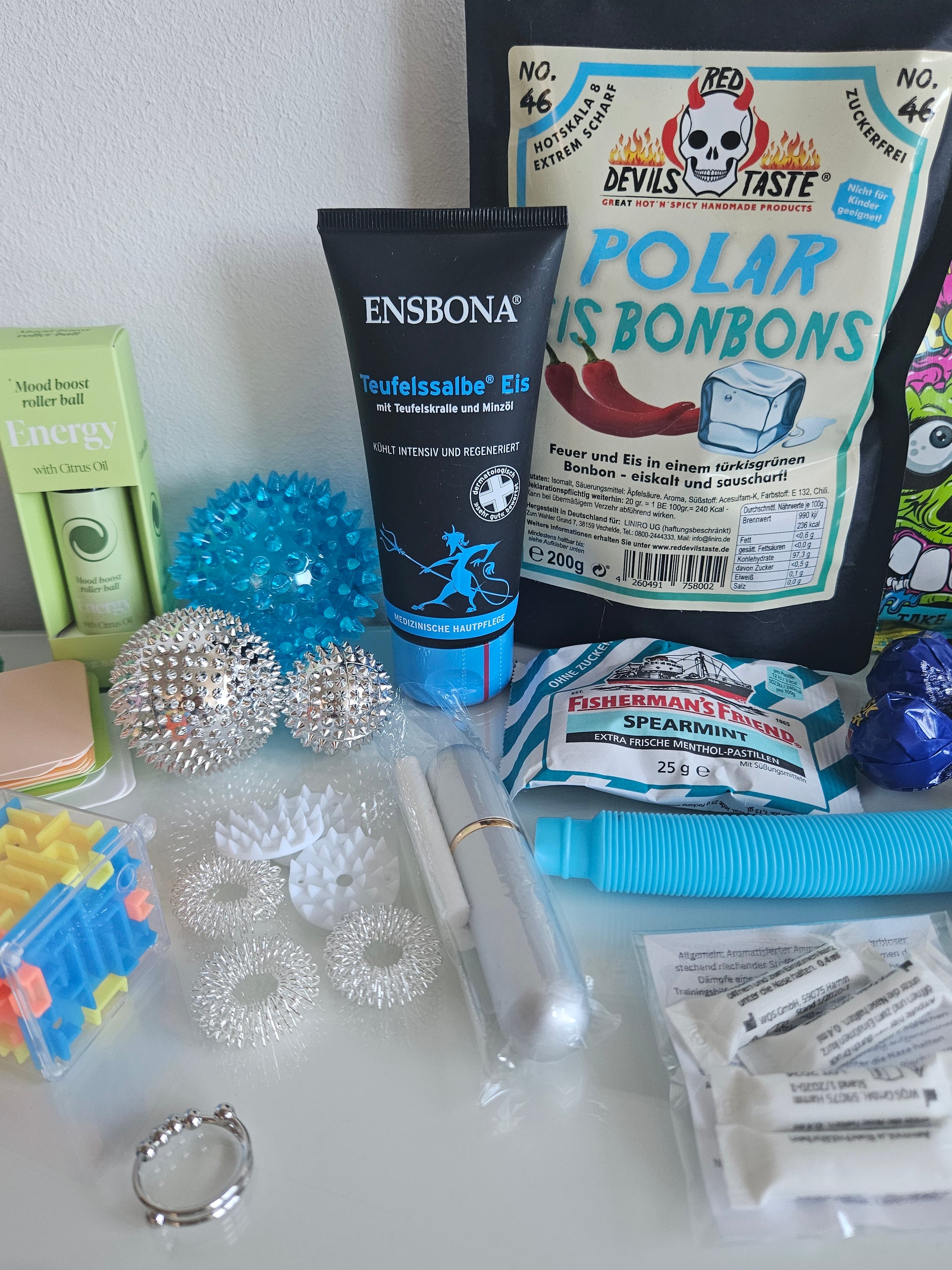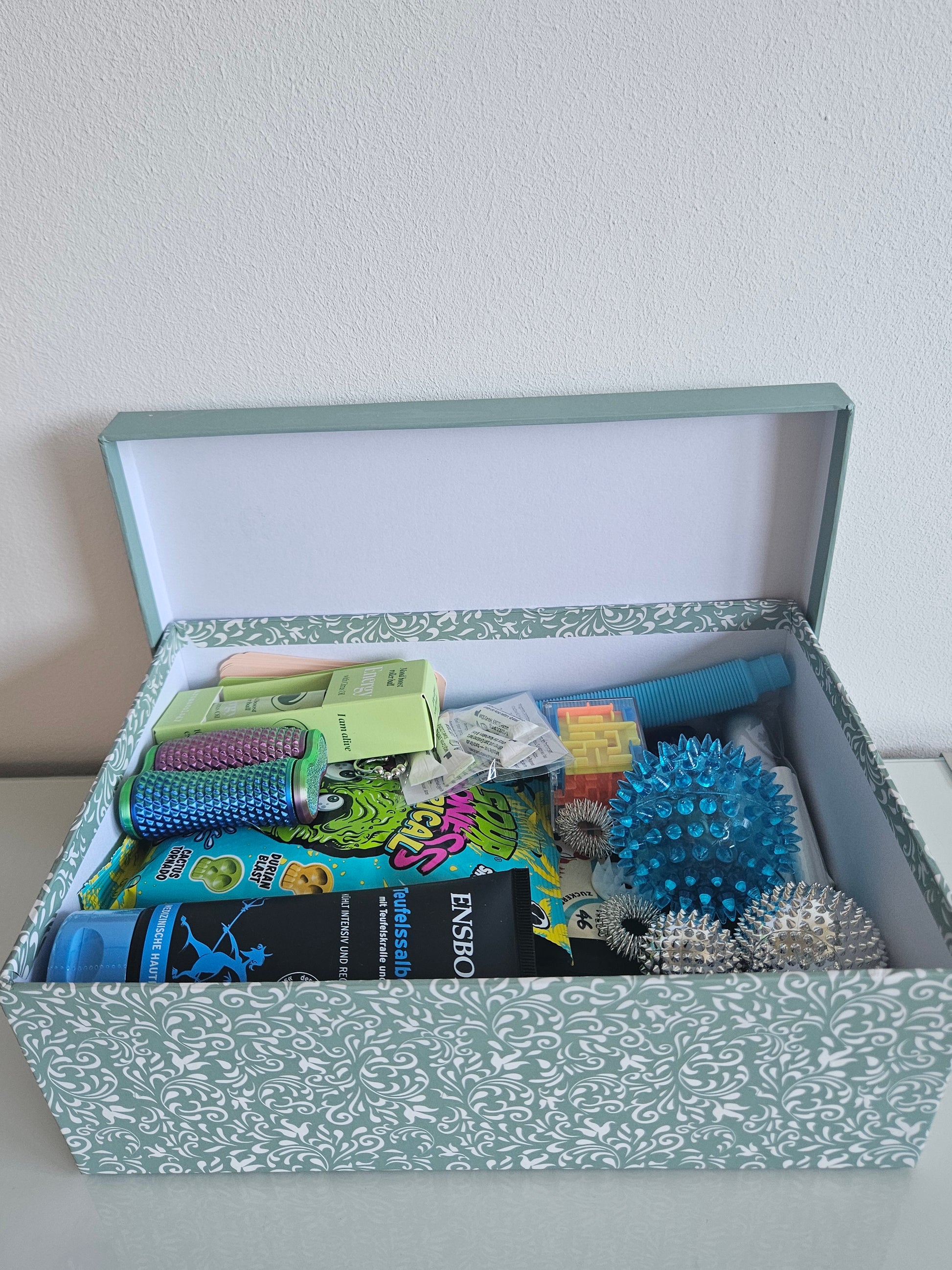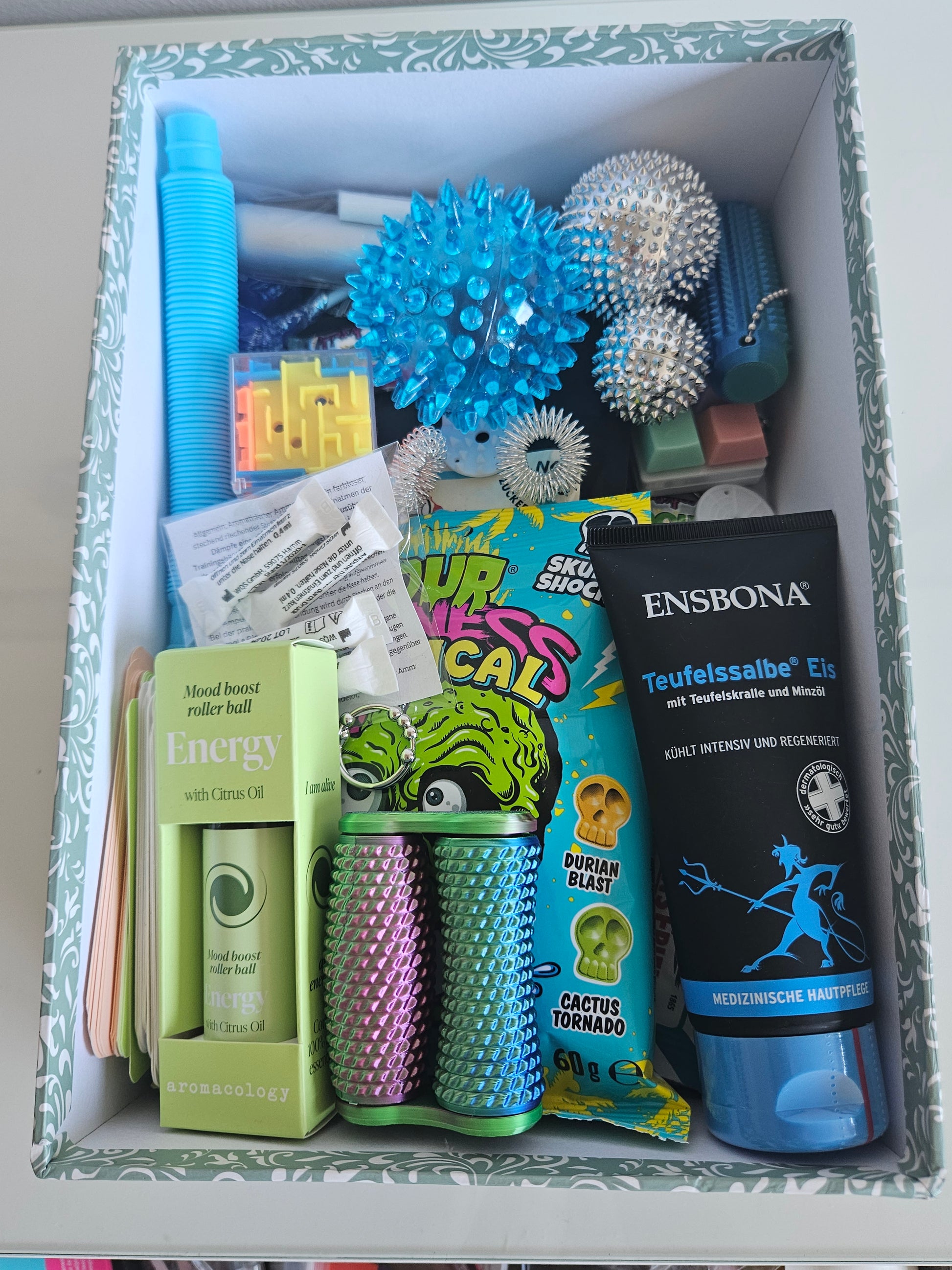 Diese Skillskiste bietet eine große Mischung aus verschiedenen Skills, für alle Anspannungsbereiche. Von beruhigenden Fidgets bis starken Akupressur Reizen, enthält sie alles was du brauchst.