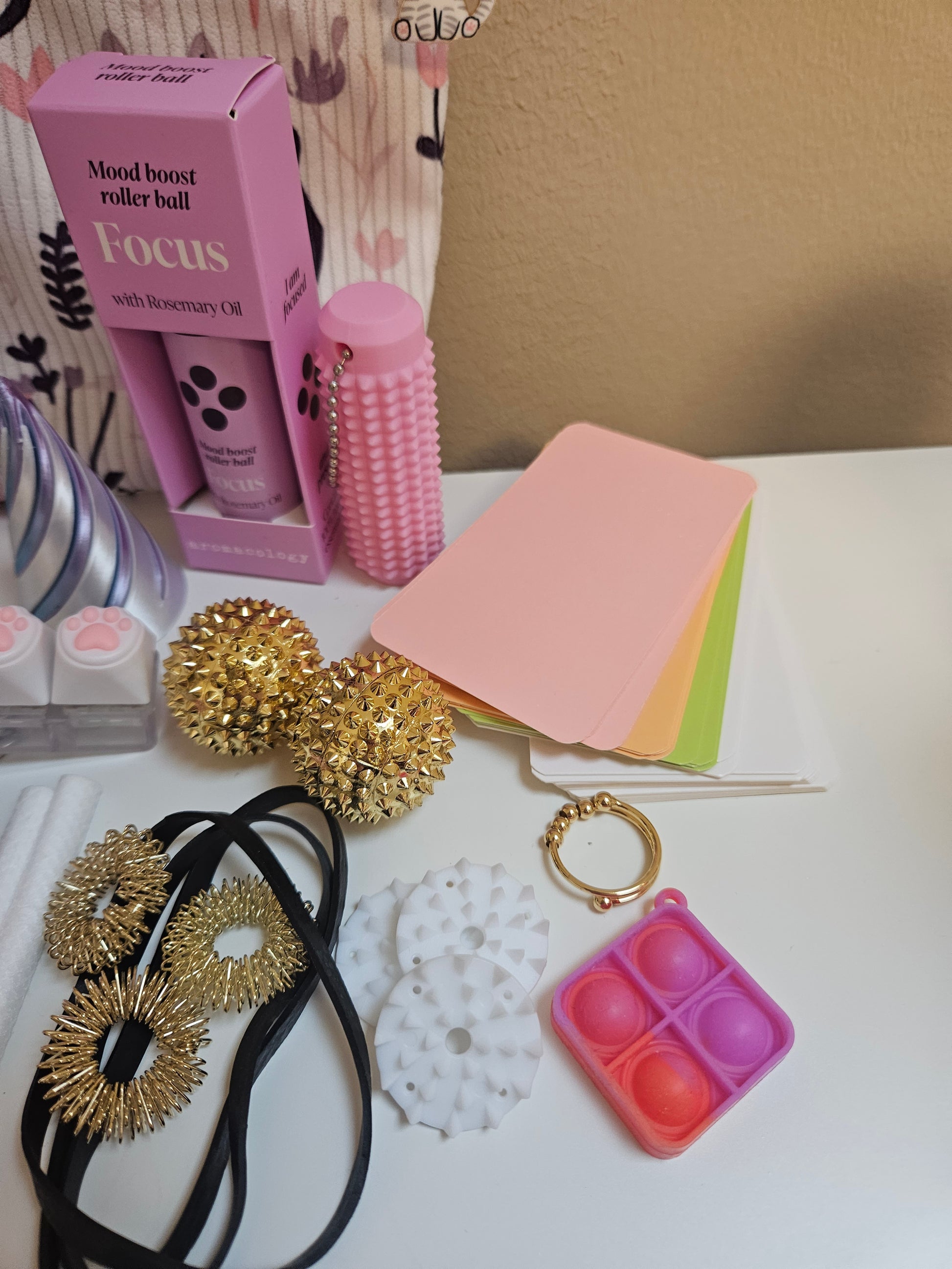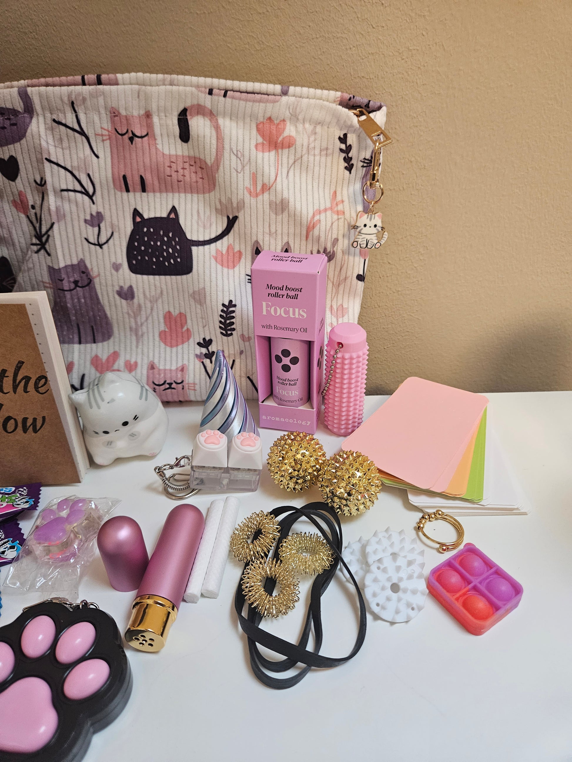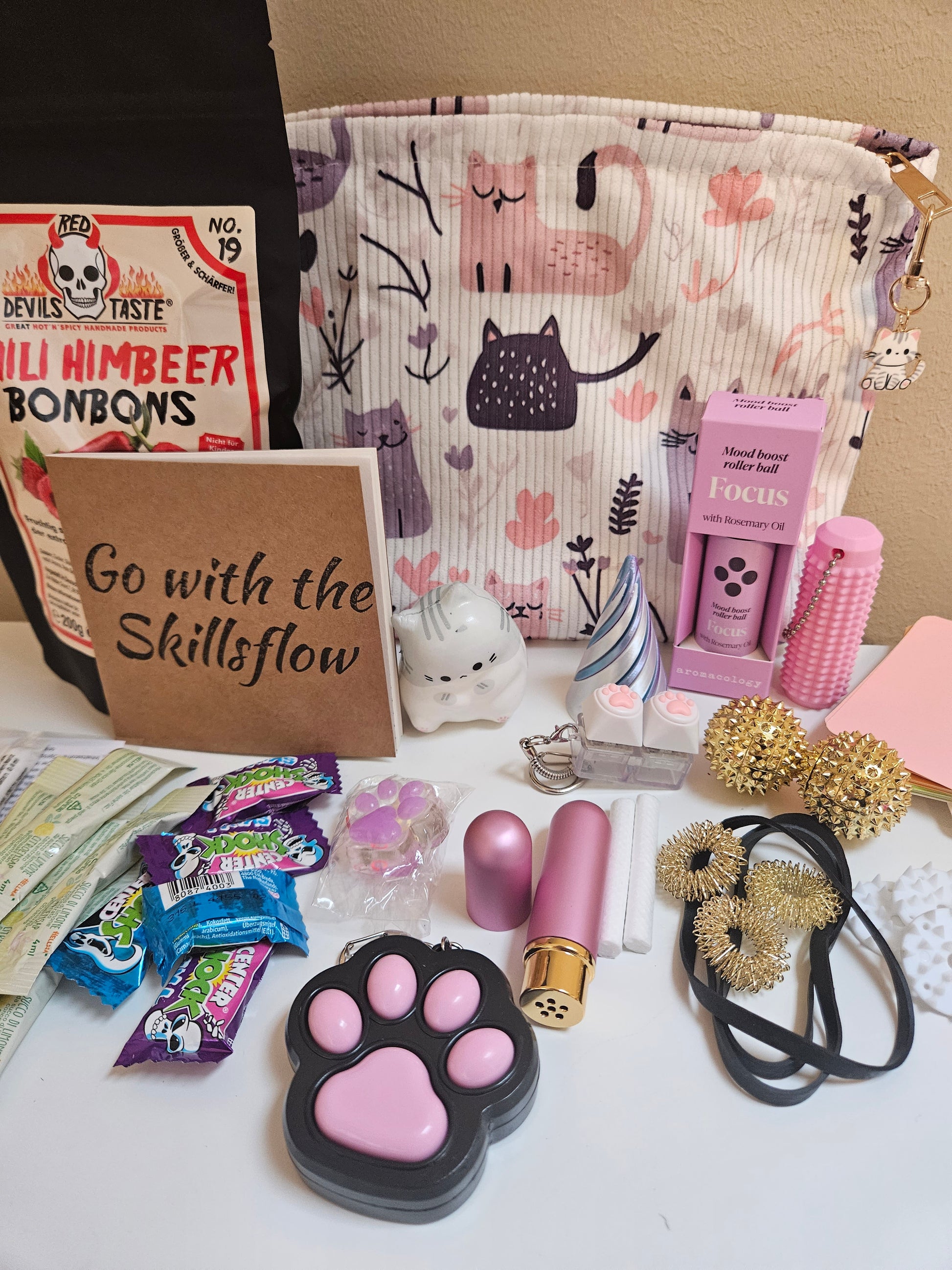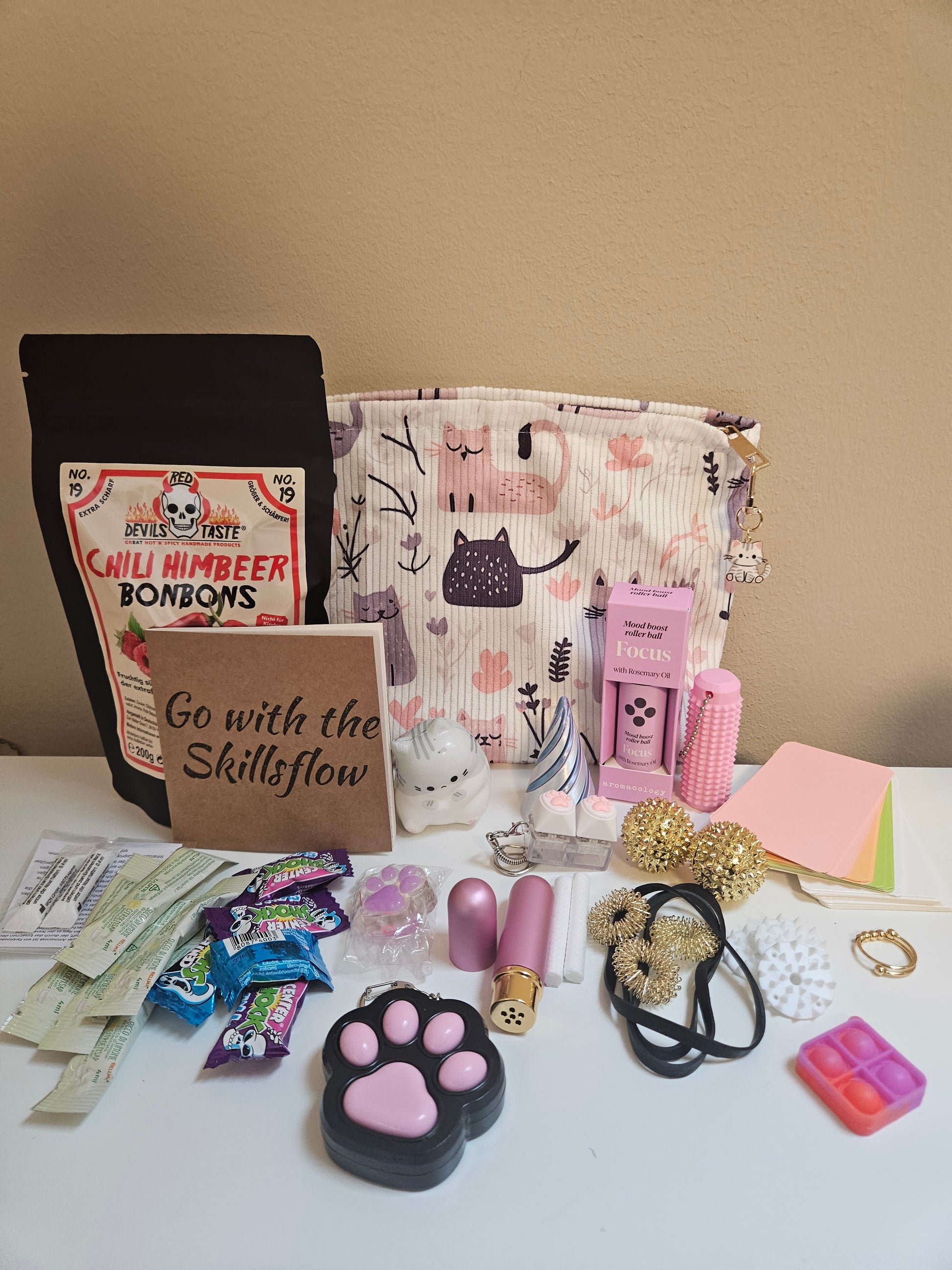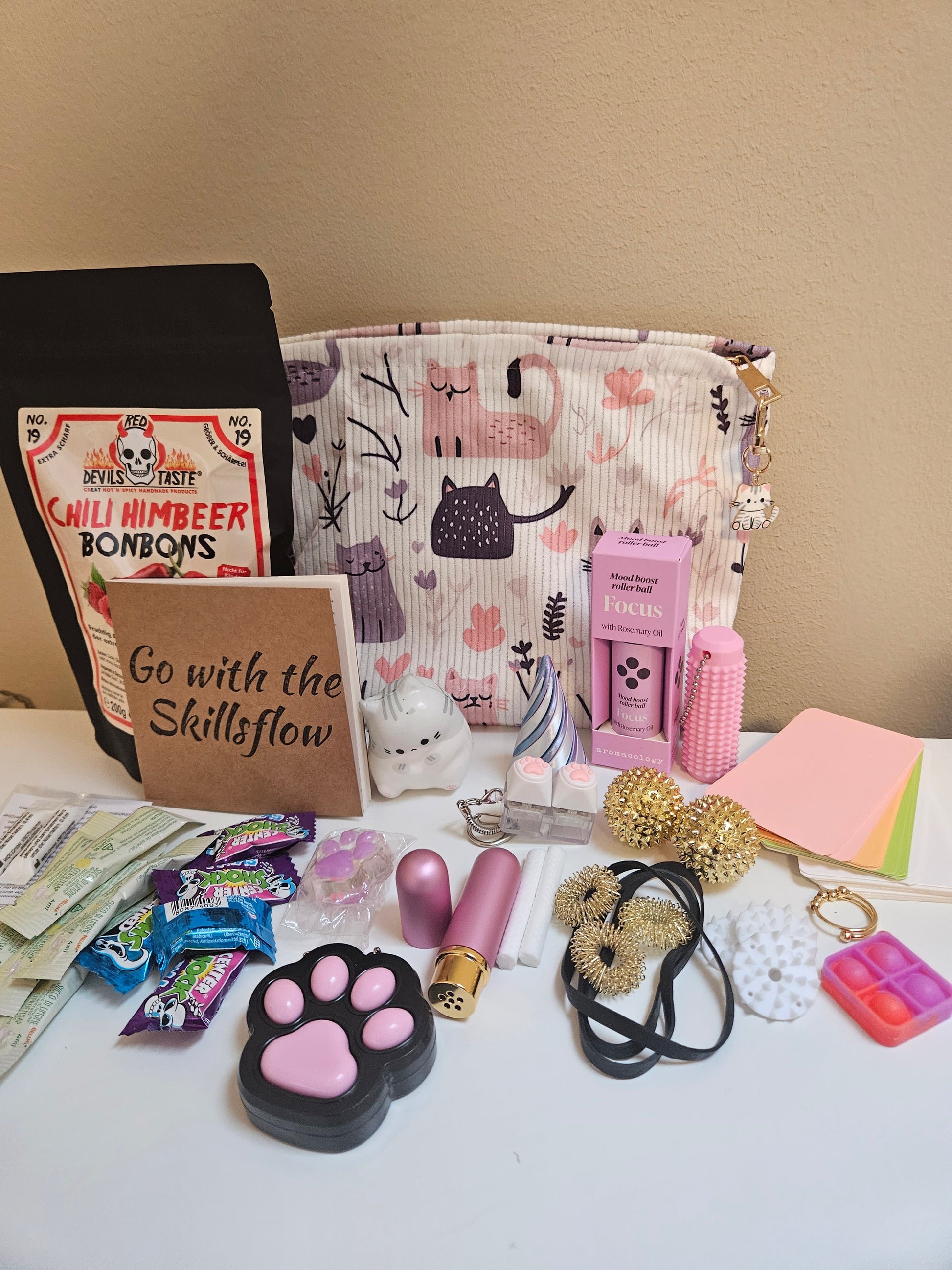 Diese süße Katzen Skillstasche bietet die perfekte Mischung aus verschiedenen Skills, für alle Anspannungsbereiche. Von beruhigenden Fidgets bis starken Akupressur Reizen, enthält sie alles was du brauchst. Außerdem beinhaltet sie ein schöner Fidgetring die dir bei Unruhe im Alltag helfen kann.