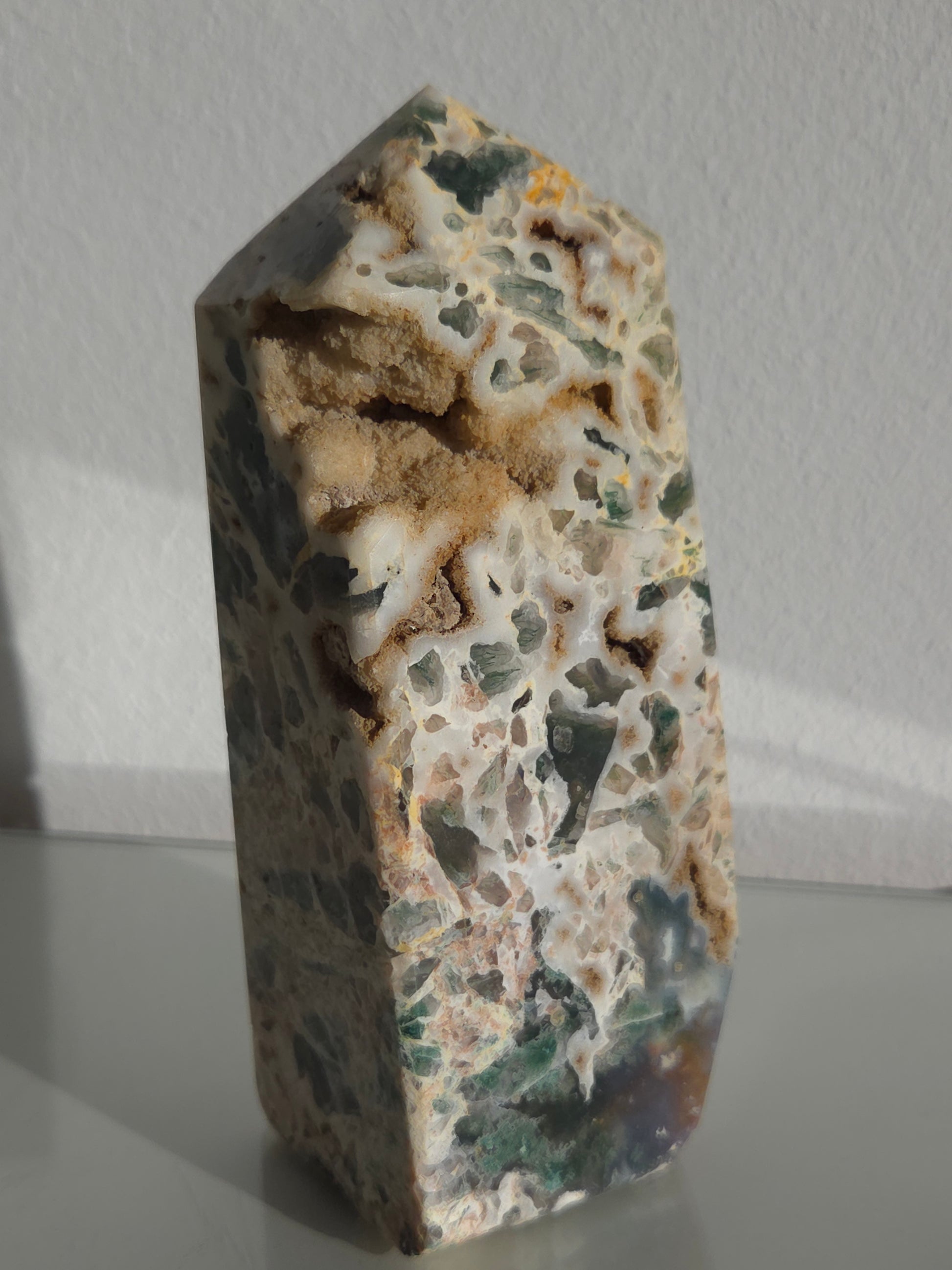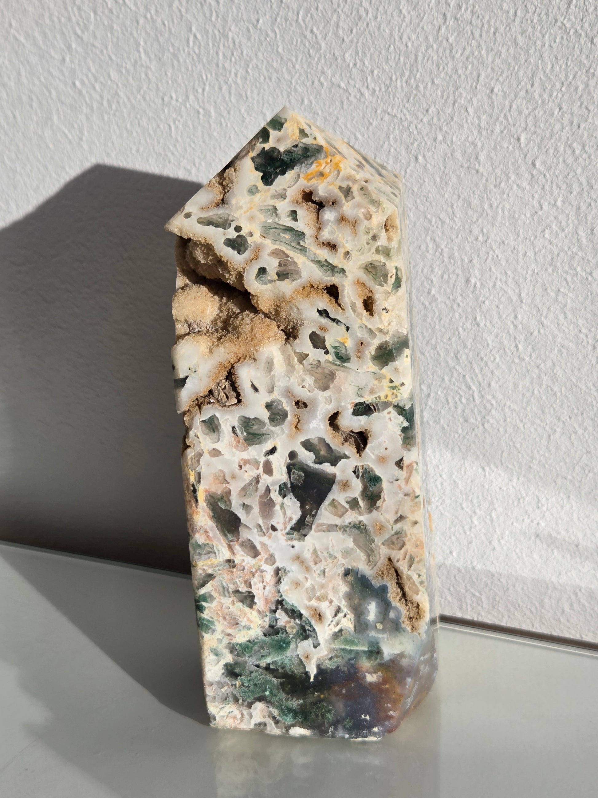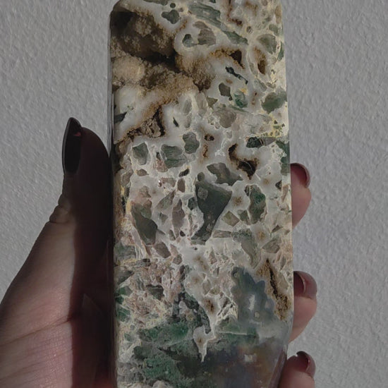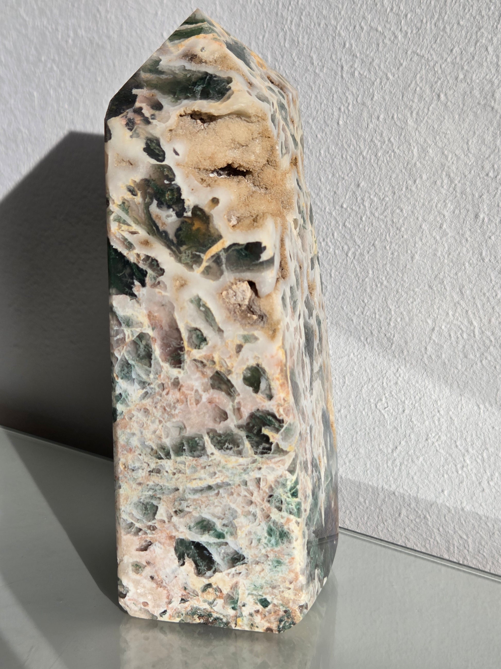 Dieser außergewöhnliche Ocean Jasper Tower besticht durch seine faszinierende Kombination aus cremeweißer Chalcedonbasis, grünen bis dunkelgrünen Einschlüssen und natürlichen, sandfarbenen Druzy-Hohlräumen. Jede Seite zeigt ein einzigartiges Muster aus organischen Formen, kristallinen Öffnungen und fließenden Farbverläufen – ein echtes Einzelstück der Natur.