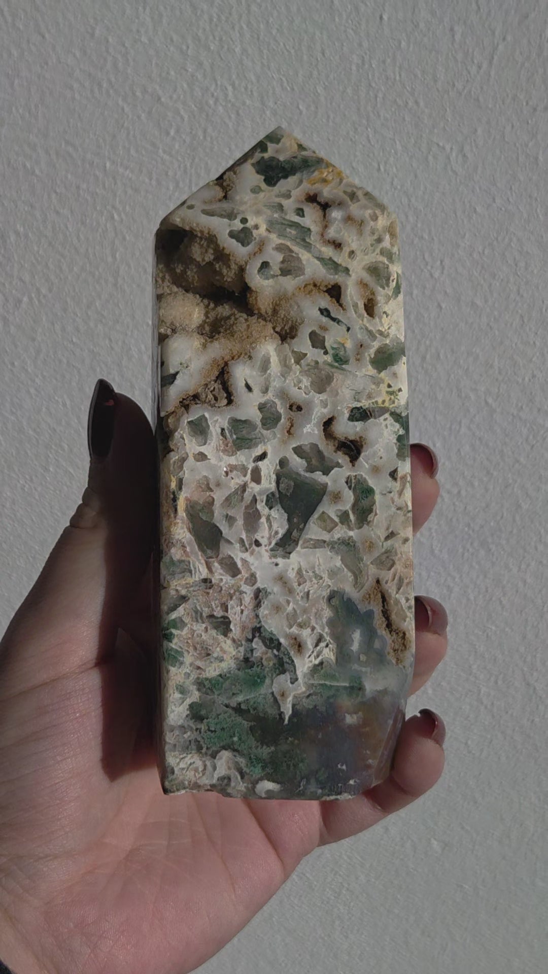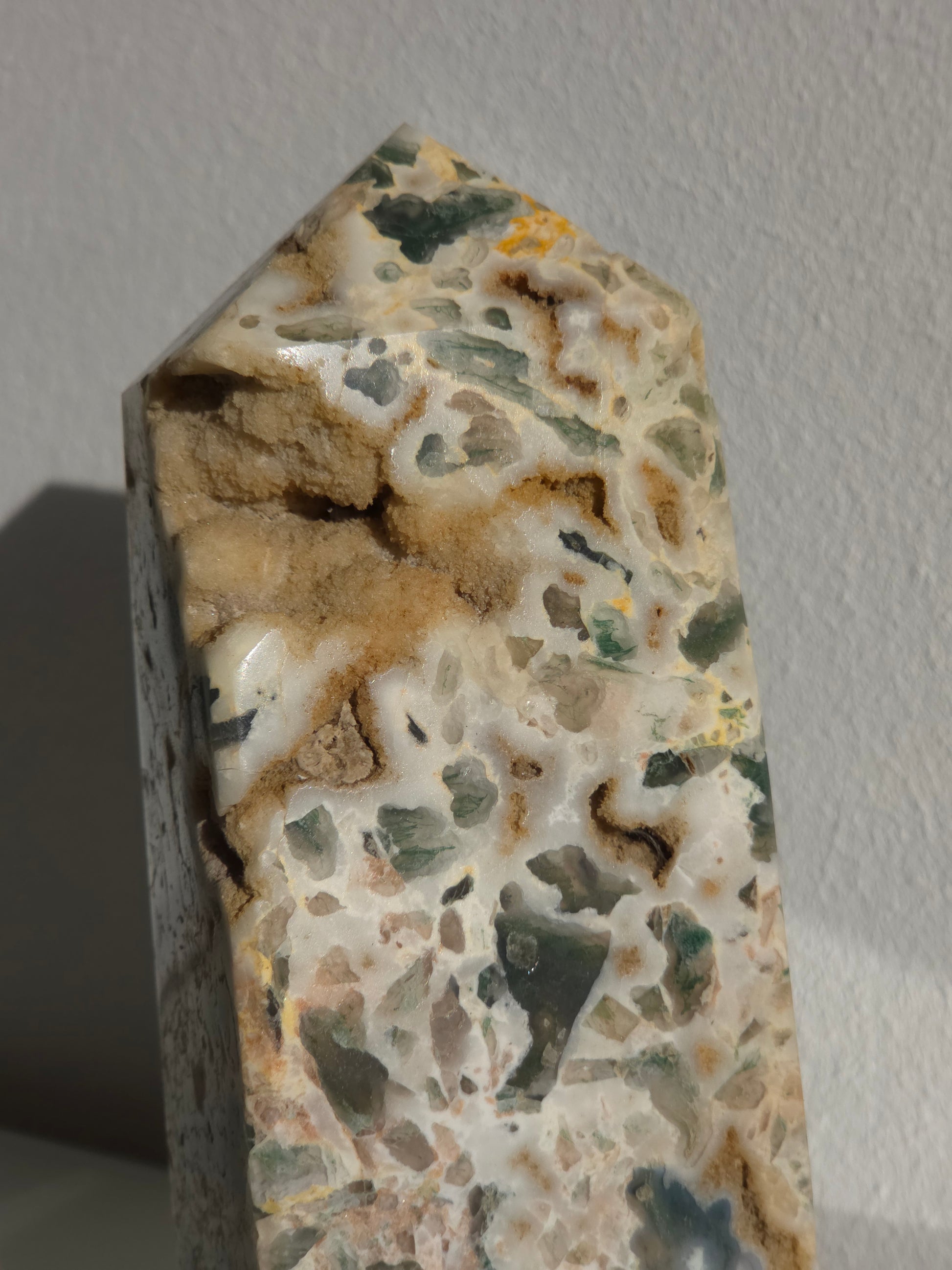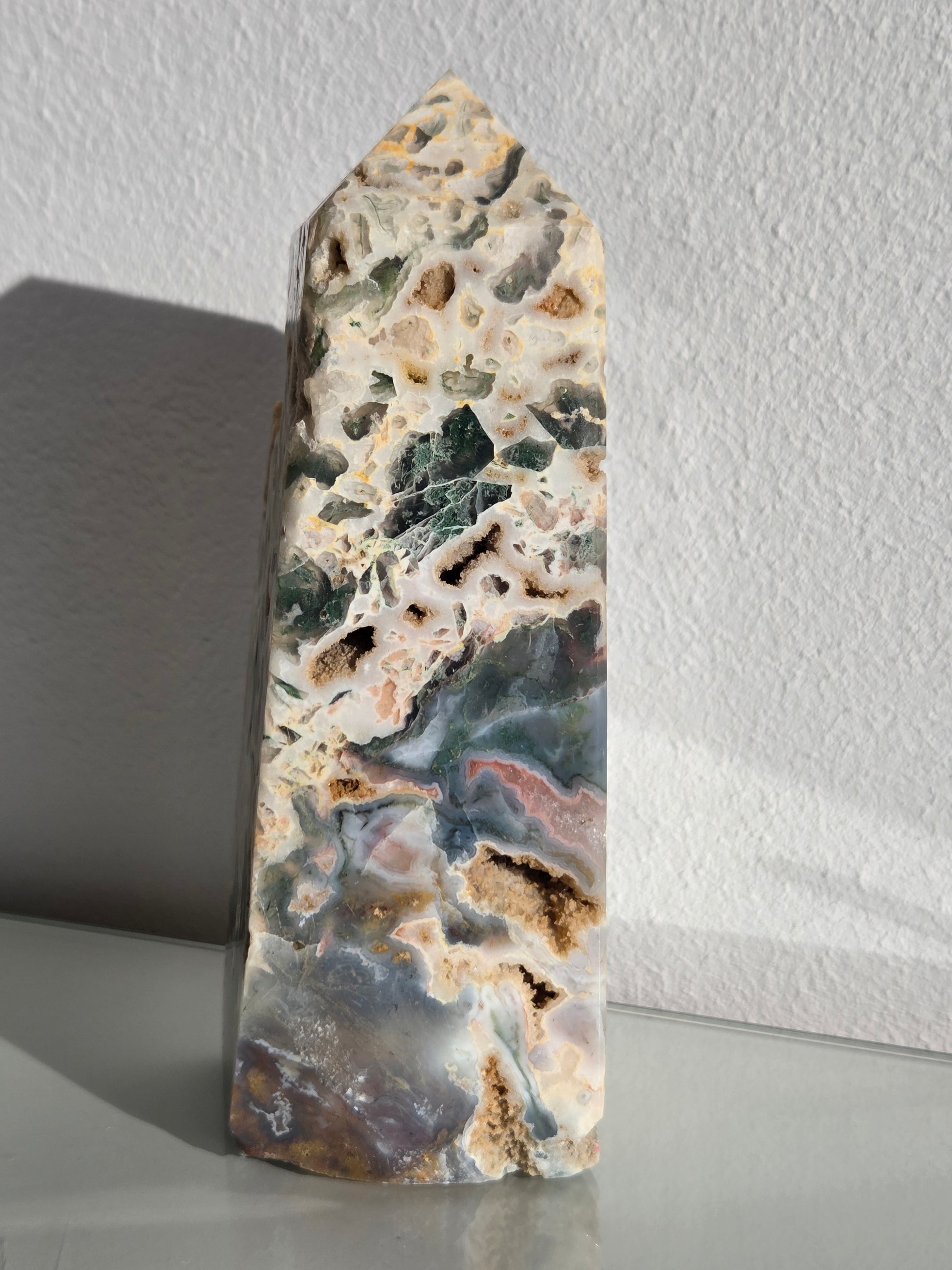 Dieser außergewöhnliche Ocean Jasper Tower besticht durch seine faszinierende Kombination aus cremeweißer Chalcedonbasis, grünen bis dunkelgrünen Einschlüssen und natürlichen, sandfarbenen Druzy-Hohlräumen. Jede Seite zeigt ein einzigartiges Muster aus organischen Formen, kristallinen Öffnungen und fließenden Farbverläufen – ein echtes Einzelstück der Natur.
